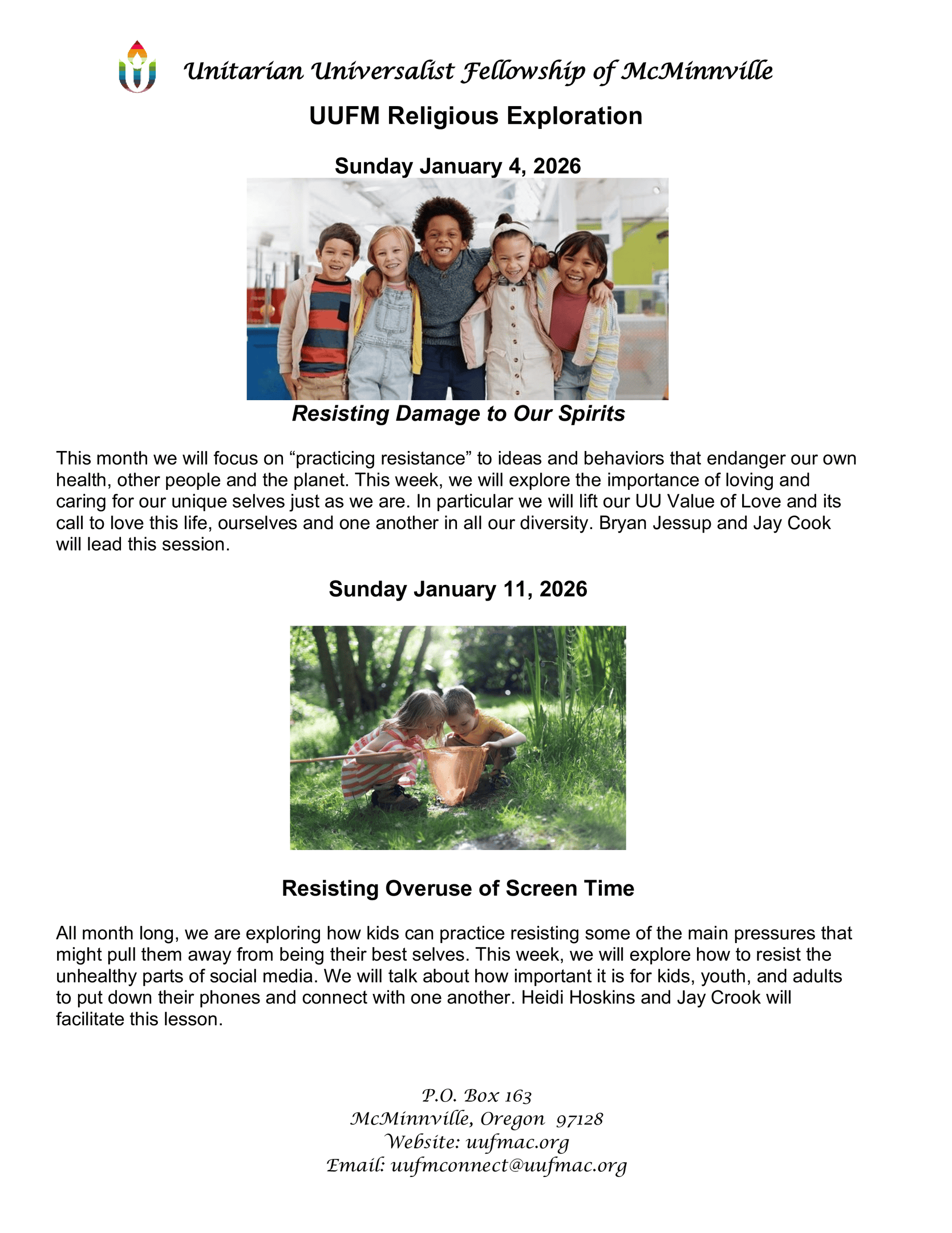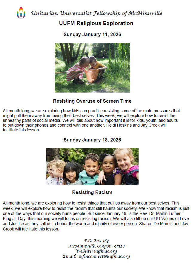 Children’s Religious Exploration, Resisting Overuse of Screen Time, McMinnville Grange. Learn More.