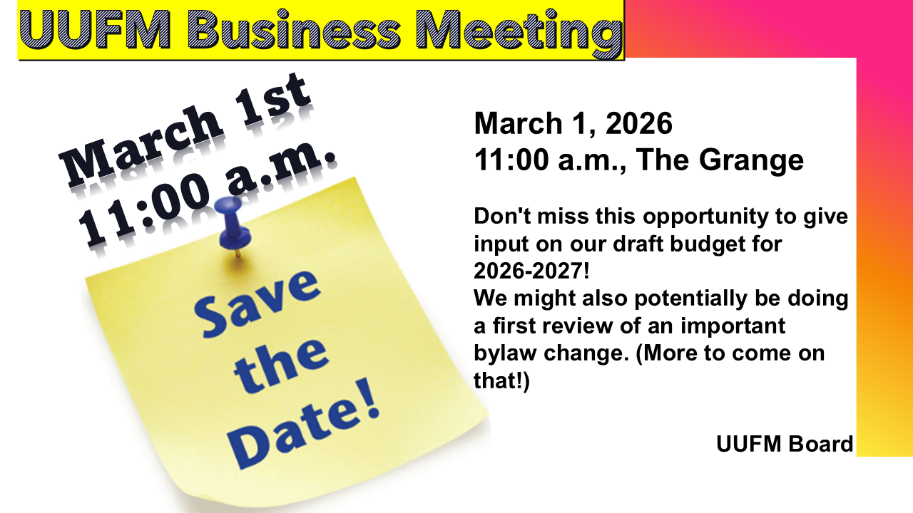 UUFM Business Meeting, McMinnville Grange. Learn More.