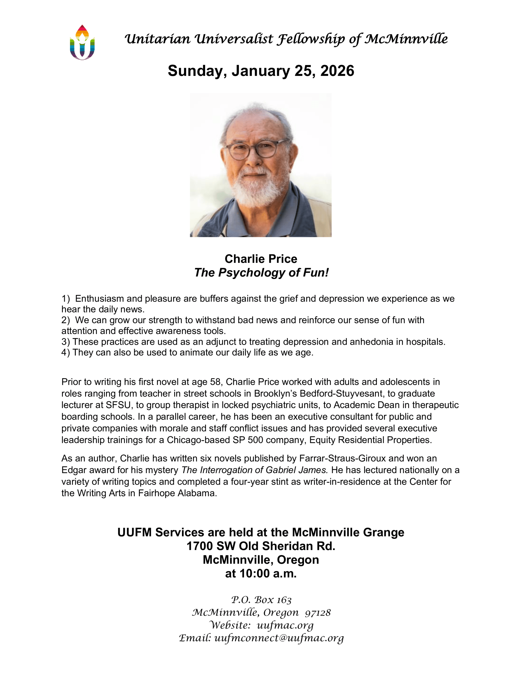 Simplified Service, Charlie Price, The Psychology of Fun!, McMinnville Grange. Learn More.
