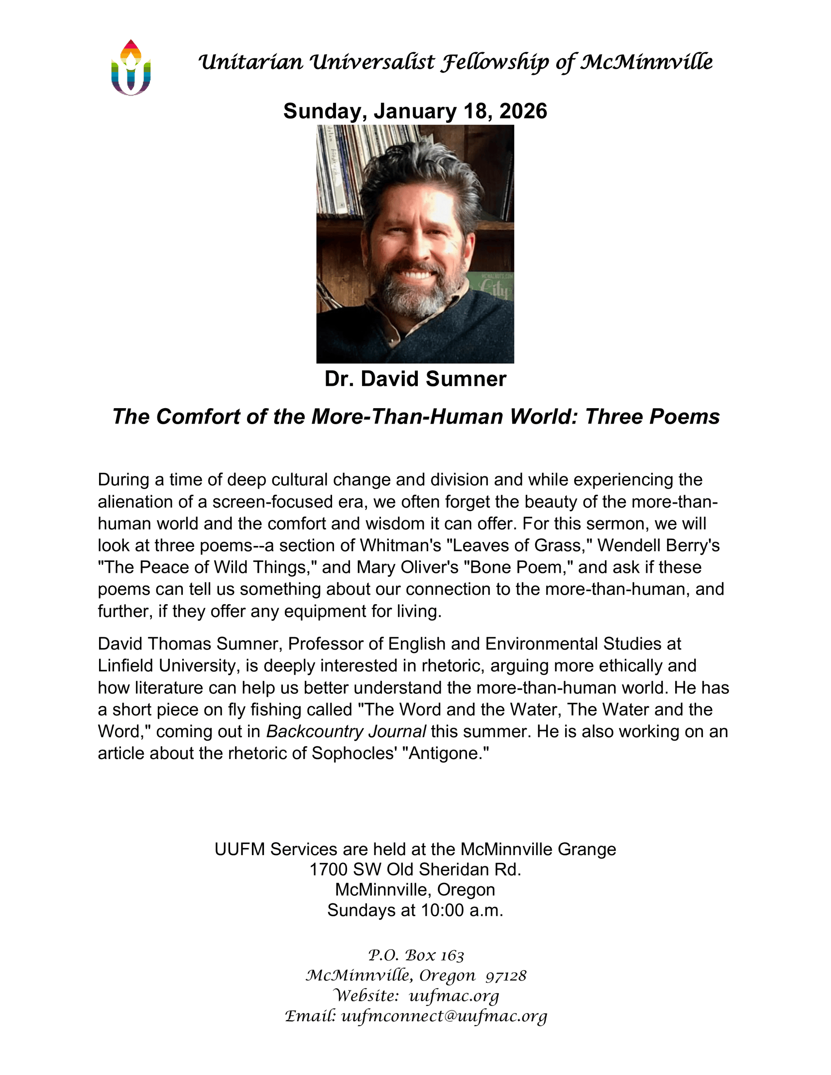 Traditional Service, Dr. David Sumner, The Comfort of the More-Than-Human World: Three Poems, McMinnville Grange. Learn More.