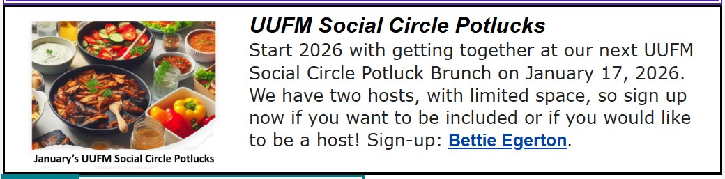 Social Circle Brunch Potluck, location(s) to be determined. These casual, friendly brunches are hosted by UUFMers in their homes. This is a wonderful way to gather, get to know one another better, share and eat awesome food and have fun!! Email Bettie Egerton to attend and/or host.