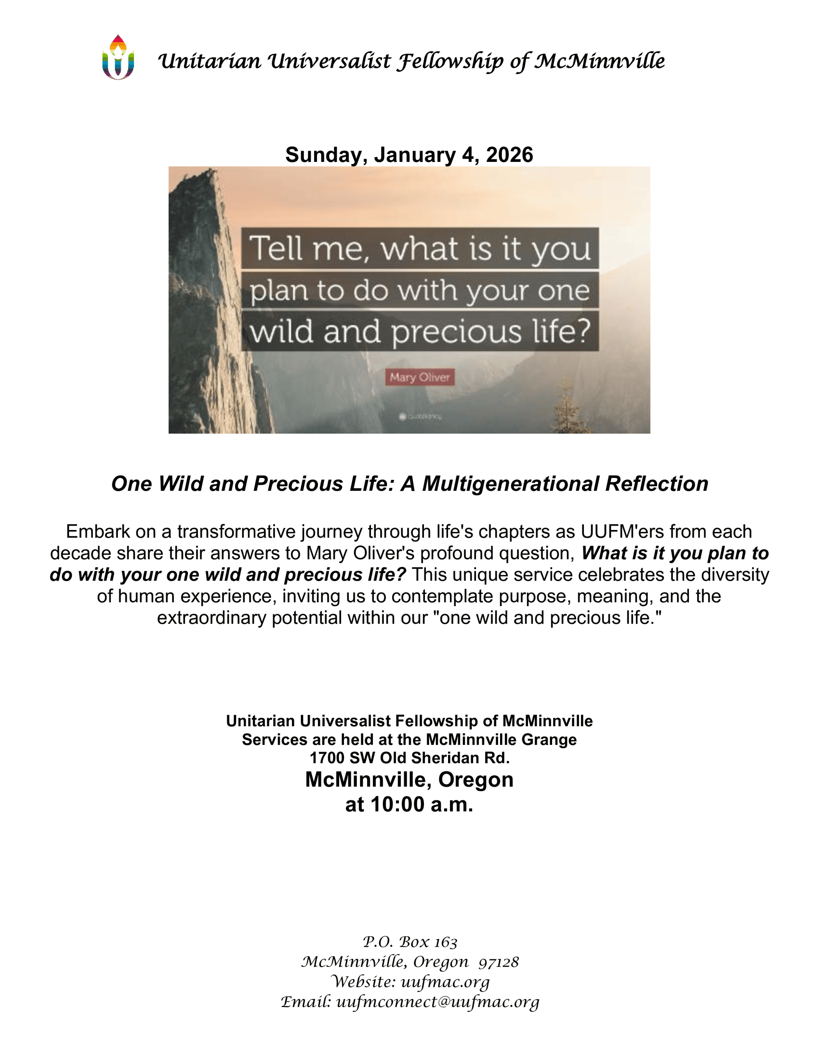 Embark on a transformative journey through life's chapters as UUFMers from each decade share their answers to Mary Oliver's profound question, What is it you plan to do with your one wild and precious life? This unique service celebrates the diversity of human experience, inviting us to contemplate purpose, meaning, and the extraordinary potential within our "one wild and precious life." McMinnville Grange. Learn More.