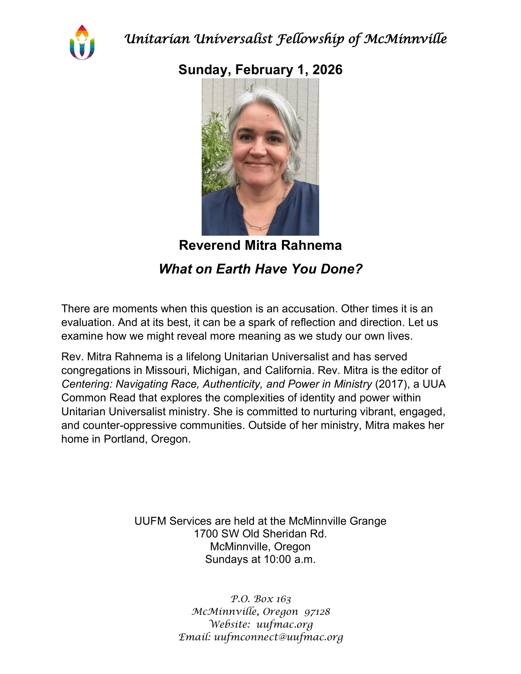 Traditional Service, Rev. Mitra Rahnema, What on Earth Have You Done?, McMinnville Grange. Learn More.