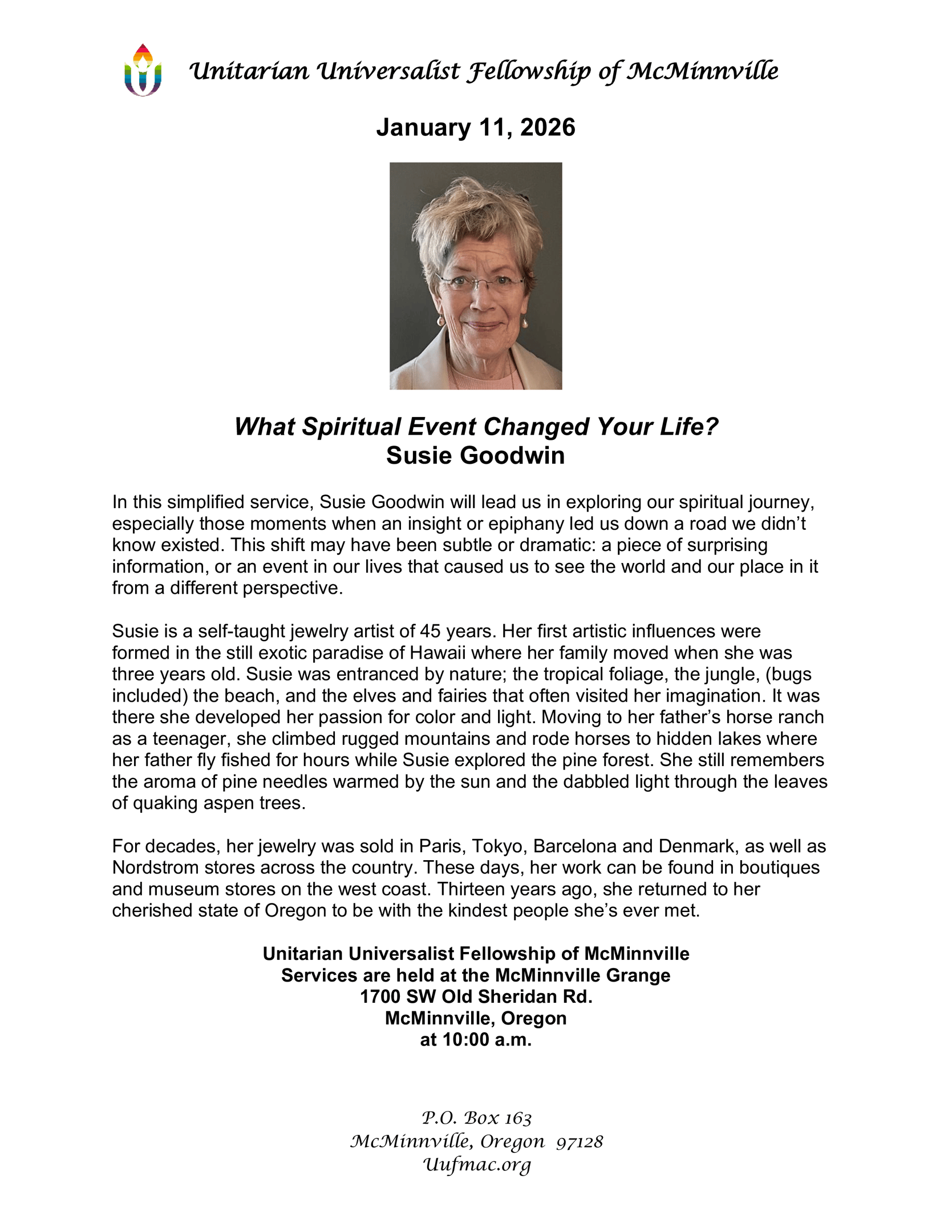 Simplified Service, Susie Goodwin, What Spiritual Event Changed Your Life?, McMinnville Grange. Learn More.