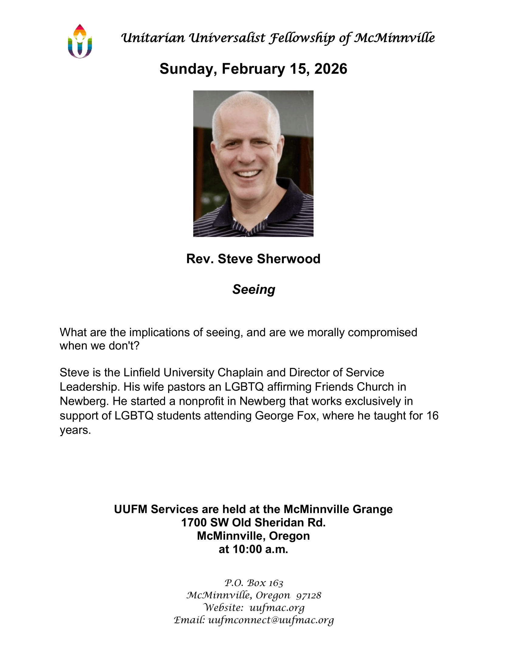 Traditional Service, Chaplain Steve Sherwood, Seeing, McMinnville Grange. Learn More.