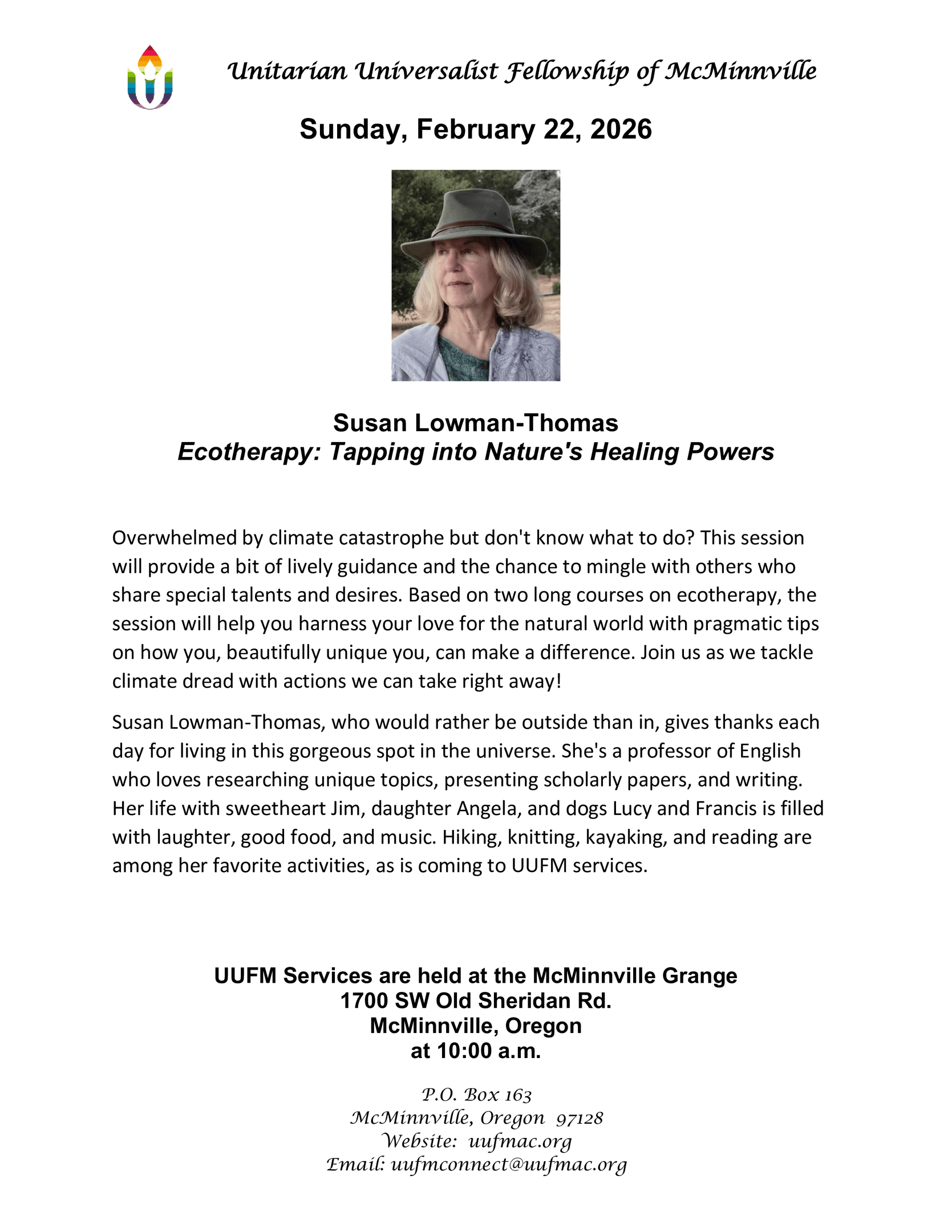 Simplified Service, Susan Lowman-Thomas, Ecotherapy: Tapping into Nature's Healing Powers, McMinnville Grange. Learn More.