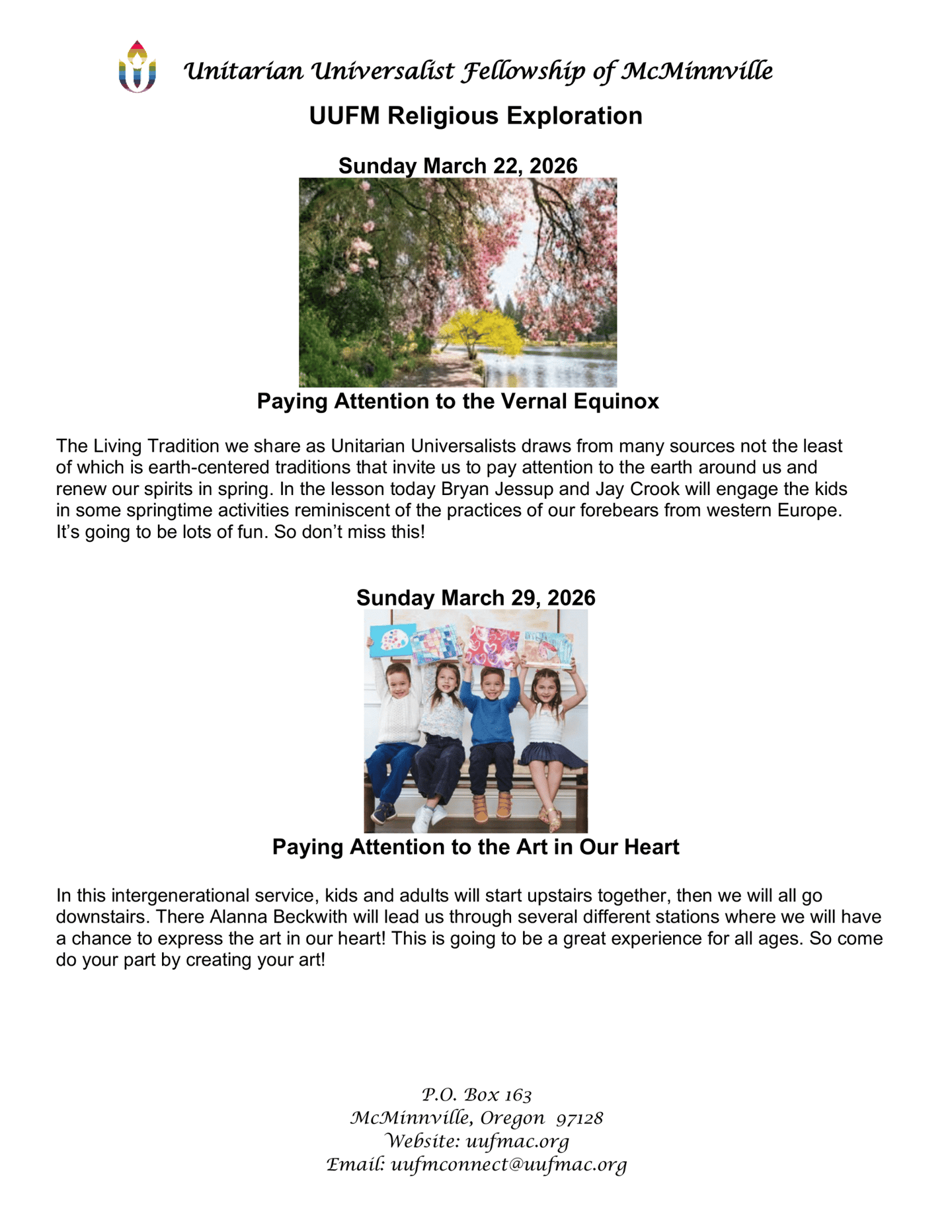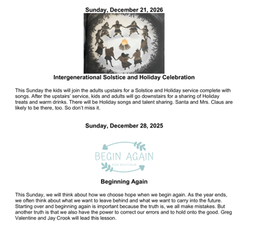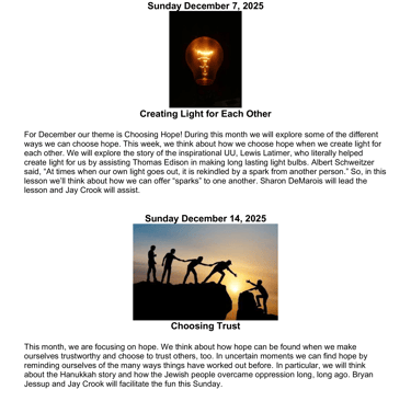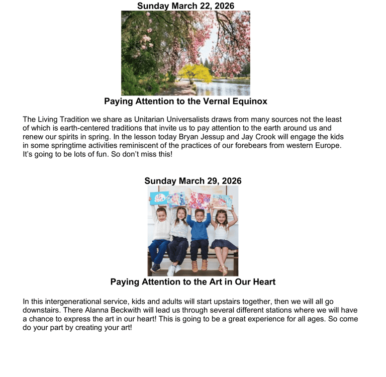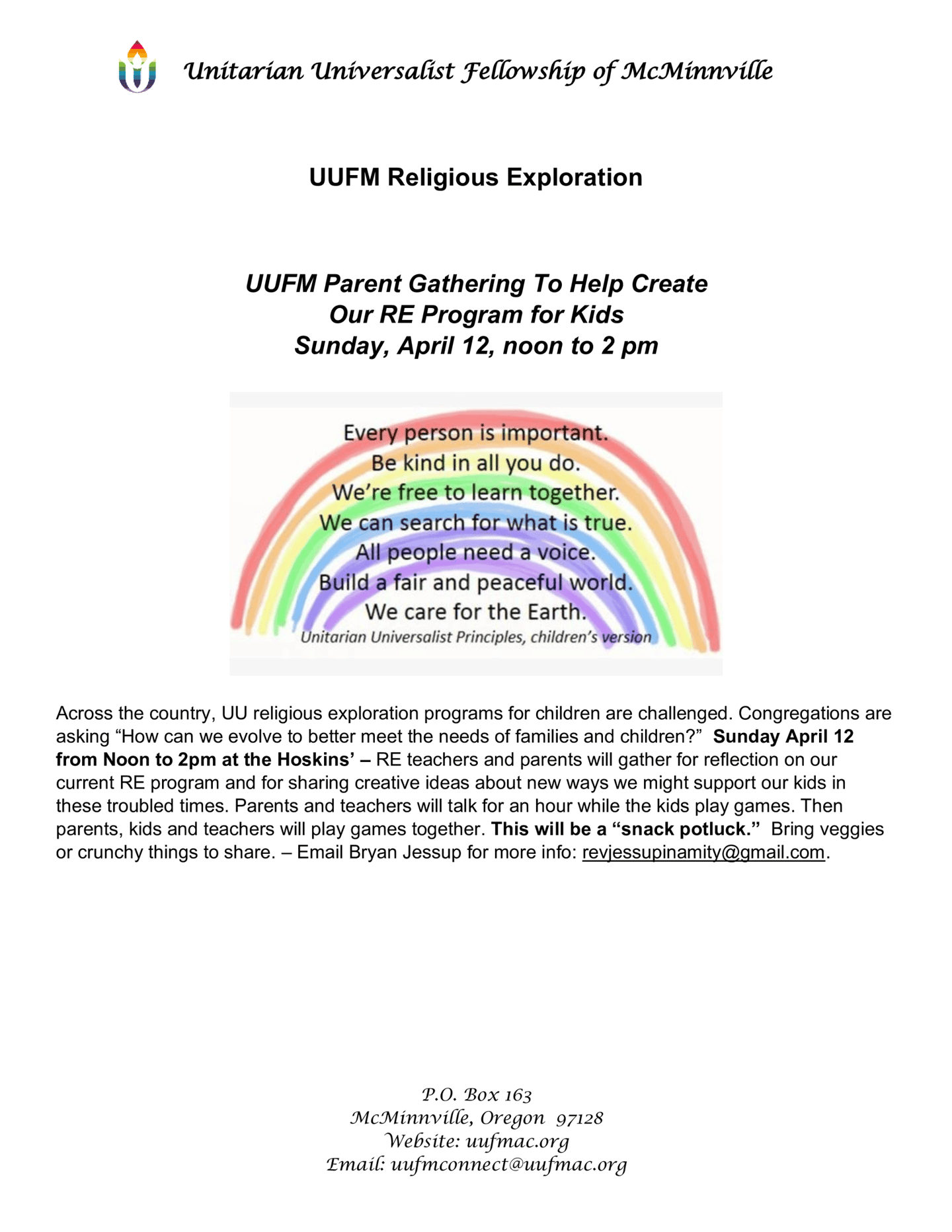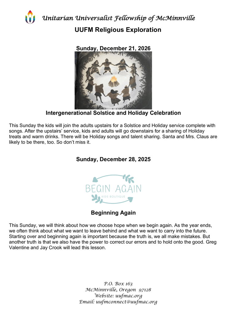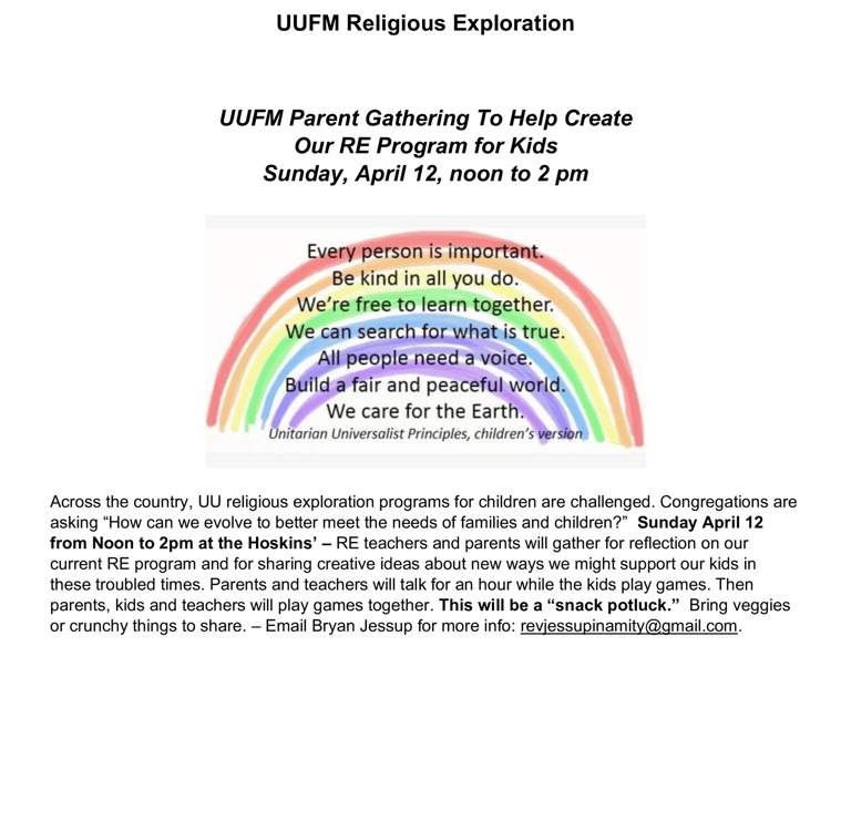 UUFM's Children's Religious Exploration classes take place in the lower level of the Grange during our Sunday services. We have a "one room schoolhouse" setting with children of all ages together. Two adults or more facilitate the lessons with the children participating as they are able at their own levels and the older kids helping out the younger ones. Blocks and toys are available for the littlest ones.